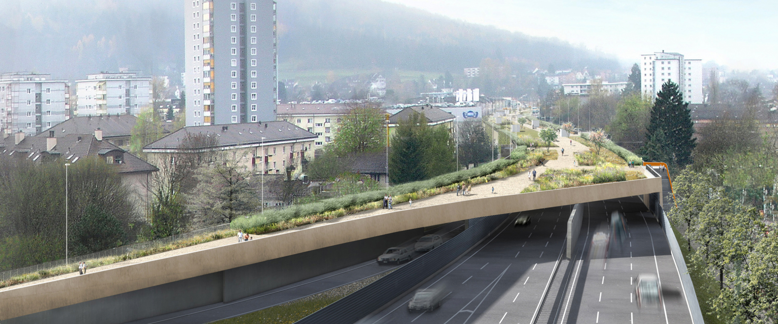Auf der Einhausung entsteht eine Parkfläche mit Längs- und Querverbindungen für Fussgänger und Radfahrer. Der Hochpark wird mit Rampen, Treppen und Liften beiderseits mit der Stadtebene erschlossen; dies stellt die mit der Nationalstrasse verlorengegangenen Querverbindungen im Quartier wieder her. Für die angrenzenden Wohngebiete entstehen damit völlig neue Entwicklungsperspektiven.