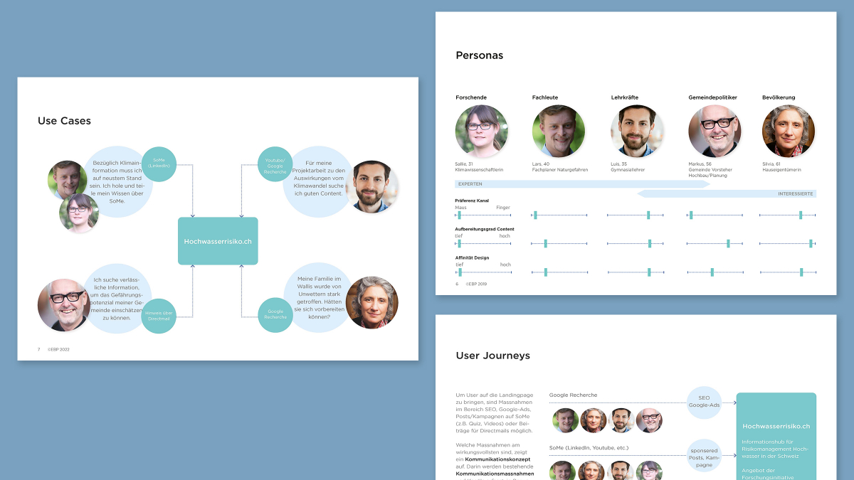 Die Forschungsinitiative Hochwasser des Mobiliar Labs für Naturrisiken will primär Behörden, Fachpersonen und Liegenschaftsbesitzer/-innen zu Hochwasserrisiken sensibilisieren und praxistaugliche Entscheidungshilfen zur Verfügung stellen. Dafür bietet sie gebündelt Zugang zu hochwertigen Karten, Daten, Informationen und Bildern. Anhand von User Centered Design ermittelten wir die sehr unterschiedlichen Informationsbedürfnisse und Zugänge der Zielgruppen und machten diese durch User Journeys sichtbar. Darauf basierend entwickelten wir ein Erscheinungsbild für die Landingpage der Forschungsinitiative, das optimal auf die Nutzenden abgestimmt ist und sie bei ihrer Suche, wie sie die verschiedenen Webtools verwenden können, unterstützt. Um einen übersichtlichen und konsistenten Auftritt zu gewährleisten, entwickelten wir ein Designsystem für die verschiedenen Fachapplikationen zum Thema und setzten die Landingpage um.
