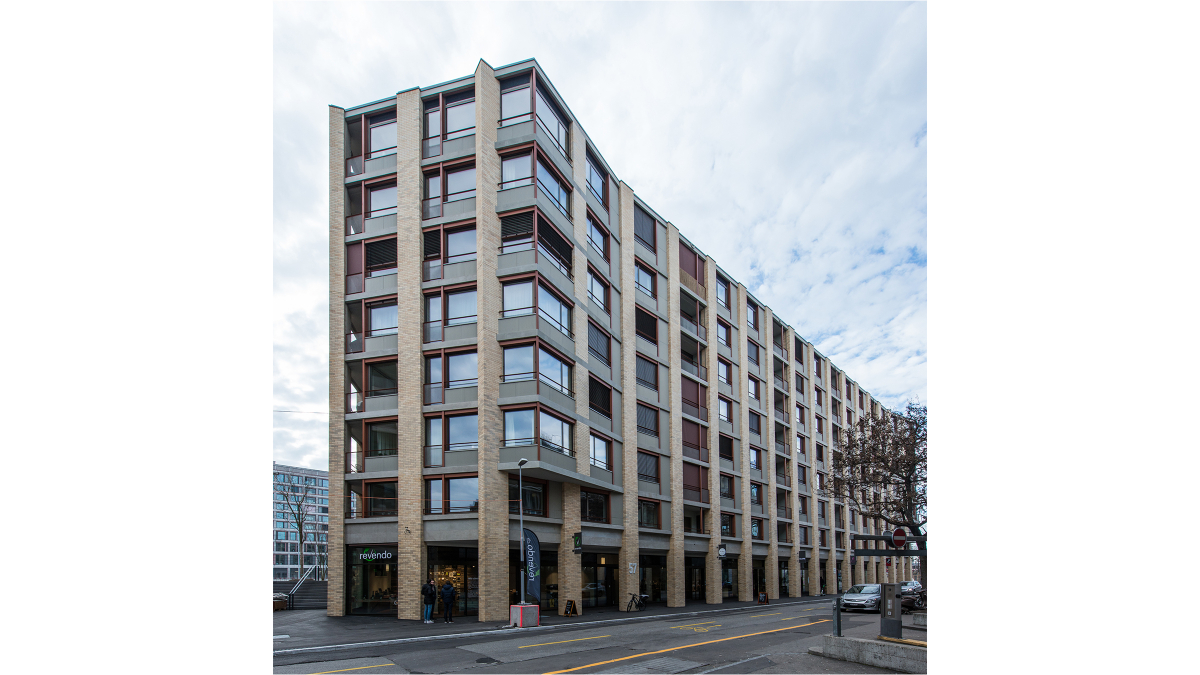 The three new buildings comprise 140 apartments, as well as a number of commer-cial enterprises and a restaurant at ground level. The impermeable building enve-lope consists essentially of wood-and-metal window frames and parapets on the upper levels. At ground level, the envelope is rendered in floor-to-floor metal post-and-beam façades. Visually striking exterior support elements of prefab concrete brick are joined to one another via concrete slab elements at each floor level. The project was certified in accordance with the DGNB sustainability standard and planned in accordance with the Minergie® Eco standard.