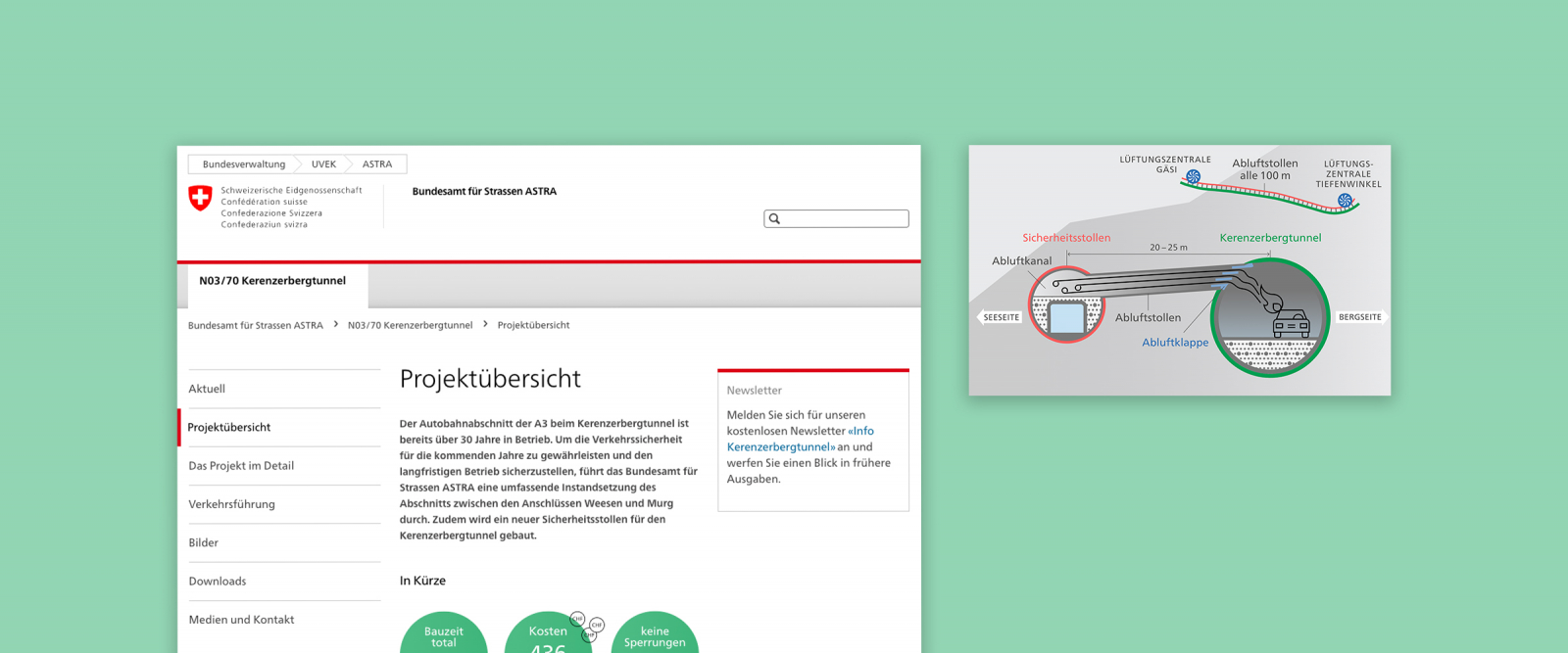 To secure public acceptance, it is crucial to help the various stakeholders (e. g. motorists, public officials, residents, walkers, media representatives, etc.) to understand the reasons for the renovation project and to help them stay abreast of the latest project-related developments. That is why the FEDRO commissioned EBP to develop and implement a stakeholder-specific communication strategy. We created a project website using the federal website design system to provide the most important background information and the latest traffic-related developments such as shutdowns and detours (www.kerenzerbergtunnel.ch). We also created a newsletter, informational brochures, fact sheets, infographics, construction-site notification boards, and media releases.