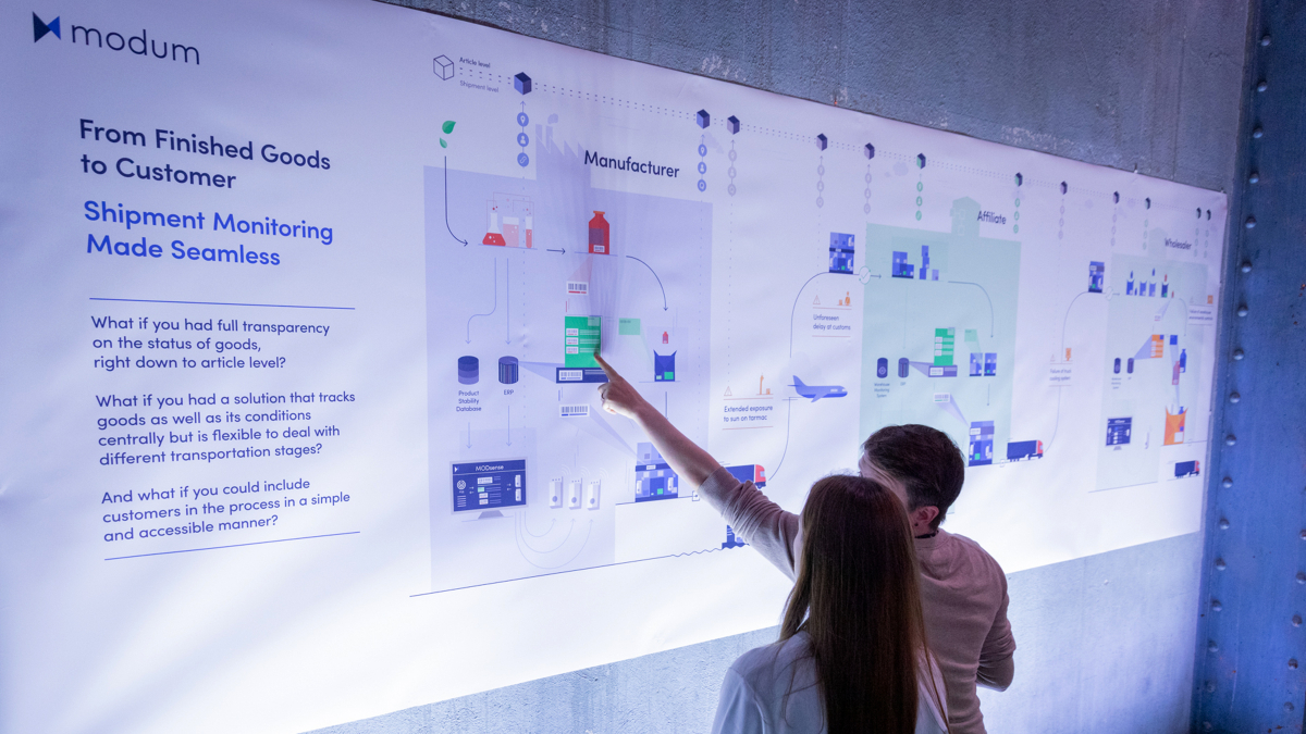 In order to offer a detailed depiction of what happens to the package during the journey shown in the explainer video, we created a large-format infographic measuring 26x5 feet. The infographic depicts the many process details and interfaces that characterize Modum’s quality-assurance solutions. With its appealing design and colors, the infographic builds complements the explainer video and seamlessly matches Modum’s corporate design. The infographic was presented at the MODday in Zurich, an event organized by Modum.