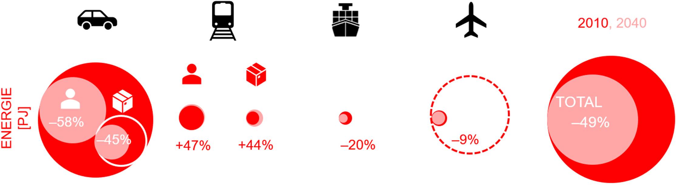 To the extent that the data were available, passenger and freight transportation is represented separately using the symbols for passengers and parcels. The graphic shows that road-based passenger transportation (dark red circle) accounts for far higher levels of energy consumption than freight transportation (dark red circle with white contour).
